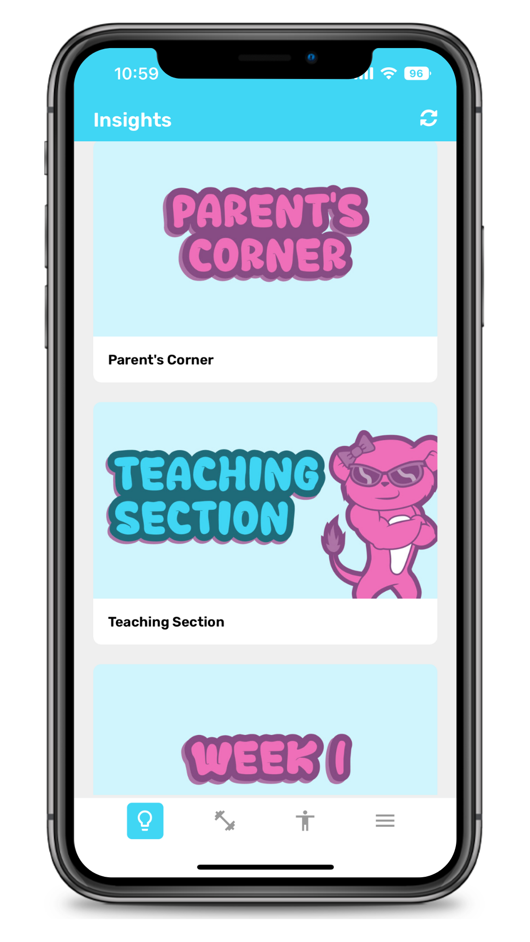 The insights section of the Savage Patch Kids app includes categories like "Parent's Corner," a teaching section, and weekly movement lessons. Tap on a category to watch more information about who we are, how to utilize the app, and how to best teach your children fundamentals of fitness.